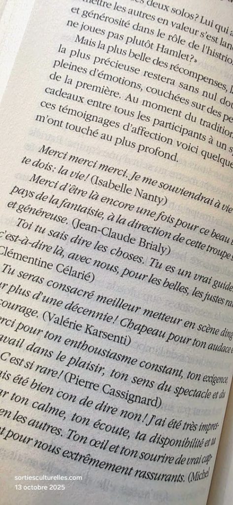Dès les premières pages, on retrouve ce ton espiègle et sincère, ce mélange d’autodérision et de lucidité qui le rend si attachant. Le titre n’est pas une promesse en l’air : Alain Sachs dit tout, sans jamais régler de comptes. Il observe, raconte, se moque gentiment et surtout, célèbre le théâtre comme un art de vivre.