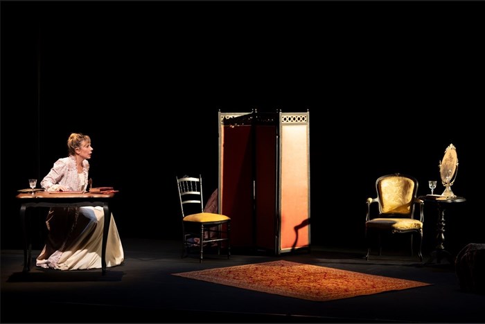 Sur scène, un décor minimaliste laisse toute la place à la parole et à la présence : un fauteuil, quelques drapés, une lumière qui glisse et tout un siècle s’anime.