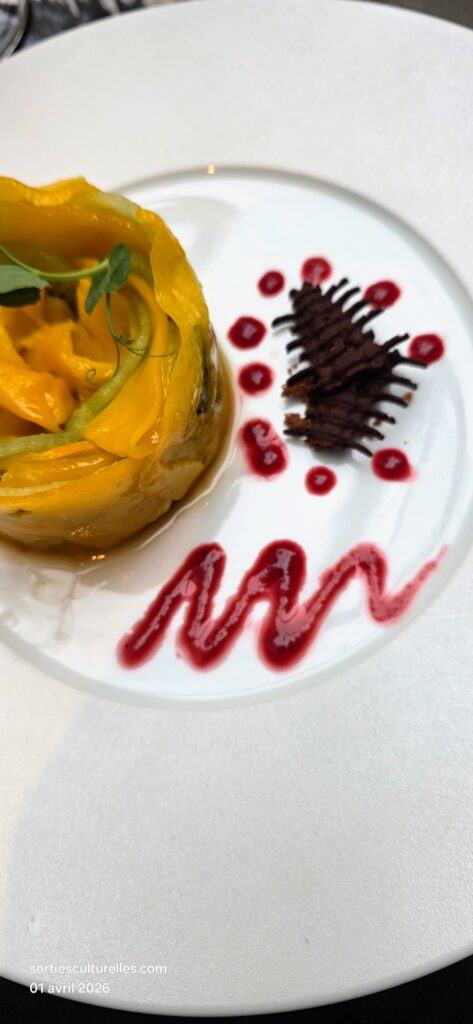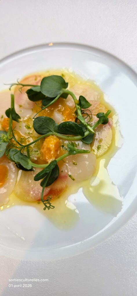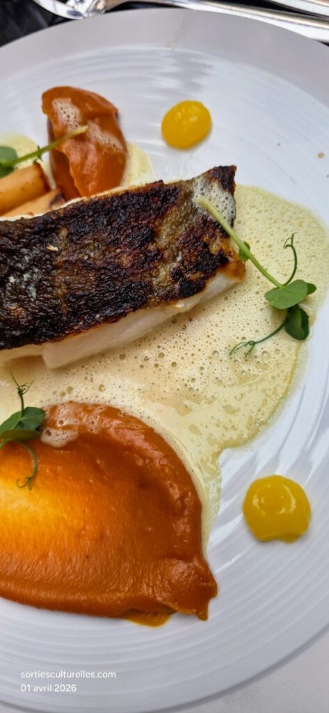 Le Carpaccio de Saint-Jacques de la Baie de Somme, betterave jaune et gel mandarine ouvre le bal avec délicatesse. La fraîcheur iodée des Saint-Jacques se mêle à des notes d’agrumes légèrement épicées, relevées par un Sancerre “Grande Cuvée” 2024 – Fournier Père & Fils, vif et minéral qui vient sublimer la finesse du plat.