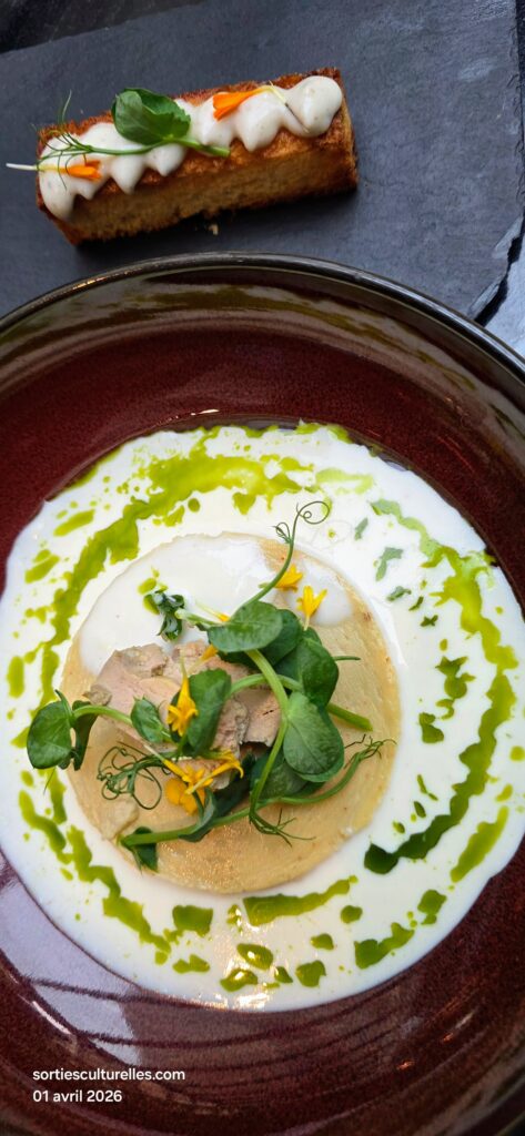 Plus gourmand, la Royale de topinambour, dés de foie gras, focaccia truffée et pickles d’oignons rouges joue sur les textures et la profondeur aromatique. L’accord avec le Côtes du Rhône “Inspiration” – Xavier Vignon apporte rondeur et structure avec des notes épicées qui prolongent la richesse du foie gras.