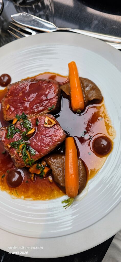 Plus terrien, le Faux-filet de bœuf, jus gourmand, légumes confits et petite purée d’oignons de Roscoff révèle une viande juteuse et parfaitement maîtrisée. L’accord avec le Châteauneuf-du-Pape “Seize Heures Vingt” – Xavier Vignon s’impose naturellement avec ses notes de fruits noirs et d’épices qui prolongent la richesse du jus.