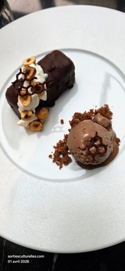 Plus intense, le Finger chocolat caramel beurre salé, glace chocolat noir maison, tuile au cacao et noix de pécan torréfiées joue sur la gourmandise et les textures. L’accord avec le Pinot Noir rouge – Fournier Père & Fils surprend et fonctionne, apportant une belle fraîcheur et des notes de fruits rouges qui équilibrent la richesse du chocolat.